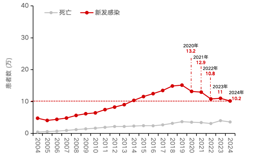 图1. 中国每年新报告 HIV 感染者和死亡病例数量(引自讲者会议幻灯)