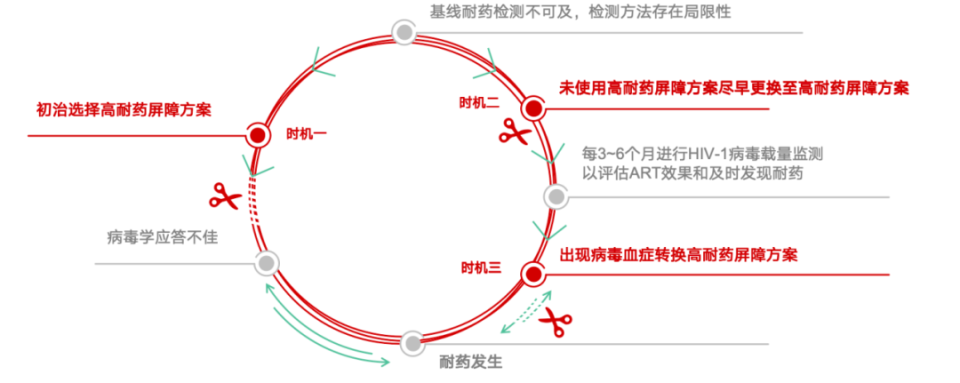 时机三是在出现病毒血症时转换至高耐药屏障方案。当前面临的主要问题包括出现病毒血症时采用不当的升阶梯治疗,逐阶更换核心药物,导致病载反复出现波动,增加耐药风险;免费药物手册将病毒学失败定义为病载>1000 c/ml,而最新指南将其定义为>200 c/ml,新标准下需思考病载在50-200或200-1000 c/ml间波动的感染者如何处理;有数据显示我国HIV感染者依从性随治疗时间的延长而下降,第一周依从性良好者占比81.8%,至第三个月仅为68.3%,病毒血症感染者同样面对依从性难以管理的问题[24]。