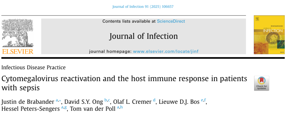 de Brabander J, Ong DSY, Cremer OL, Bos LDJ, Peters-Sengers H, van der Poll T. Cytomegalovirus reactivation and the host immune response in patients with sepsis. J Infect. 2025;91(6):106657. doi:10.1016/j.jinf.2025.106657