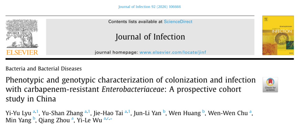 Lyu YY, Zhang YS, Tai JH, et al. Phenotypic and genotypic characterization of colonization and infection with carbapenem-resistant Enterobacteriaceae: A prospective cohort study in China. J Infect. Published online December 15, 2025. doi:10.1016/j.jinf.2025.106666