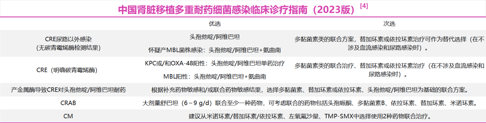 《中国肾脏移植多重耐药细菌感染临床诊疗指南(2023版)》将依拉环素列为CRE、CRAB和嗜麦芽窄食单胞菌感染的备选方案;在头孢他啶/阿维巴坦耐药时,依拉环素是联合治疗的重要选择之一。