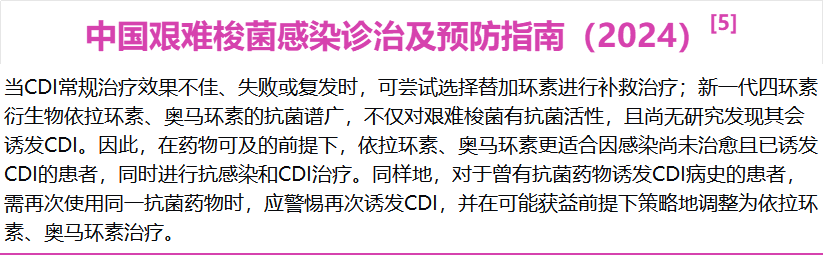 依拉环素还被推荐用于艰难梭菌感染的补救治疗,扩展了其应用范围,特别是在万古霉素或非达霉素失败后的场景。
