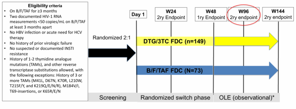 DYAD(NCT04585737)是一项在病毒学抑制的成人中开展的开放标签随机临床试验。研究的主要终点是使用FDA快照算法在意向治疗人群中评估第48周时HIV-1 RNA≥50 c/mL的患者比例。研究结束时,获得受试者的知情同意,通过电子病历收集和报告截至第96周和第144周的病毒学疗效、安全性和持续用药情况。使用两样本t检验比较治疗组间在第96周时肌酐、肾小球滤过率、血脂参数、体重和BMI的平均变化。