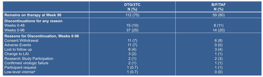 4. B/F/TAF持续组96周内没有药物相关不良事件导致的停药,DTG/3TC转换组为7%