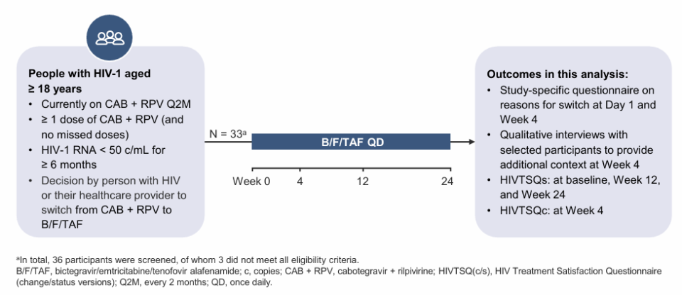 EMPOWER(Evaluating Many PeOple With HIV aftER switching from CAB + RPV to B/F/TAF)是一项Ⅳ期、单臂、开放标签、前瞻性、多中心研究,旨在评估因不耐受、不良事件或个人偏好而停用CAB+RPV的病毒学抑制HIV感染者使用B/F/TAF的安全性、药代动力学和疗效。本研究目的包括评估(1)转换后的治疗满意度,(2)从CAB+RPV转换至B/F/TAF的原因,以及(3)了解HIV感染者对注射和口服治疗的体验。