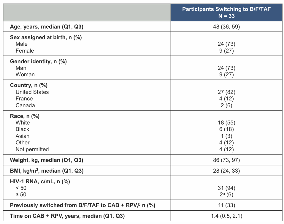 本分析报告了从CAB+RPV转换至B/F/TAF的受试者的治疗满意度和转换原因。受试者使用HIV治疗满意度问卷(HIVTSQ;变化版和状态版)自我报告治疗满意度。作为主要试验的一部分,对一小部分受试者进行了半结构化个体深度访谈,询问其决定停用CAB+RPV的原因。