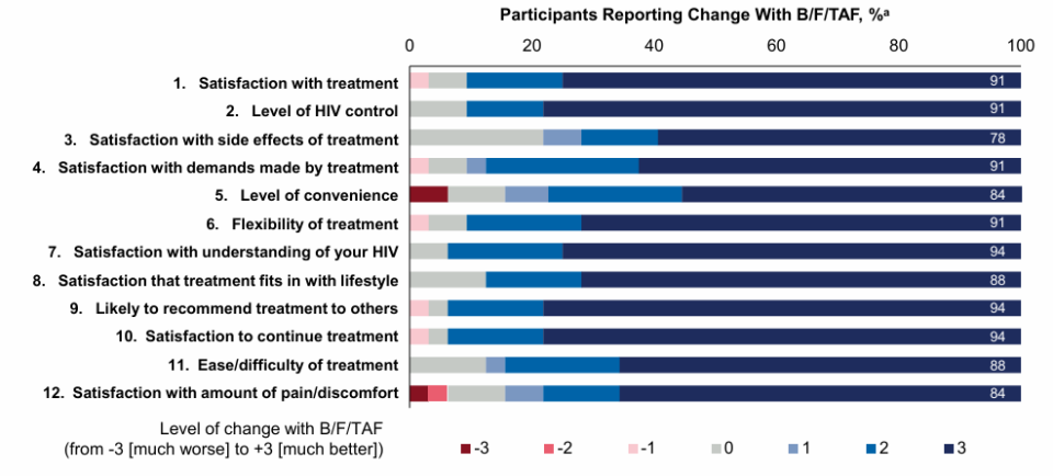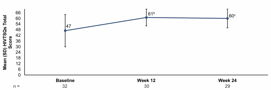治疗满意度(HIVTSQ状态版)在第12周改善,并在转换至B/F/TAF后第24周保持稳定。