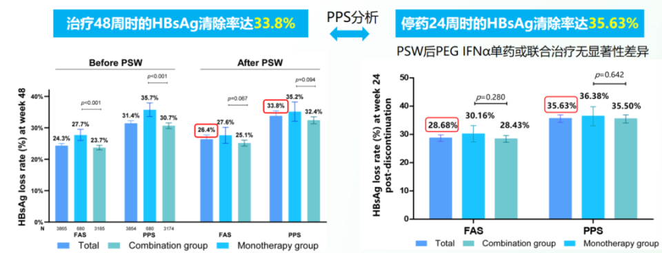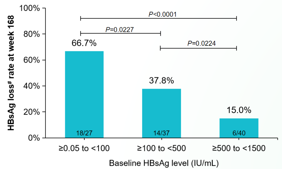 此外,在基线HBsAg<100 IU/mL的患者中,HBsAg清除率达67%,更低的基线HBsAg水平与更高的HBsAg清除率显著相关。