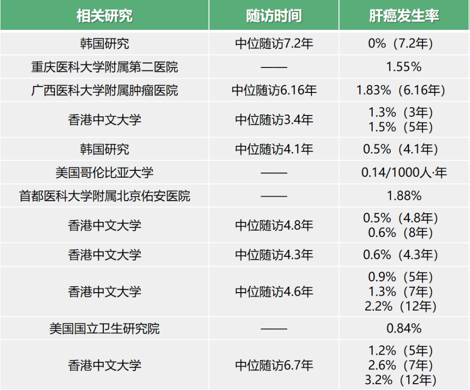 HBsAg清除可最低化慢乙肝患者的肝癌发生风险。多项研究显示,HBsAg清除可将慢乙肝患者远期不良结局发生风险最小化,5年肝癌累积发生率低至1%左右[42-53]。