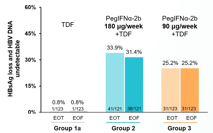 图4. NAs经治患者在EOT和EOF时实现HBsAg清除且HBV DNA检测不到的患者比例 (FAS分析)