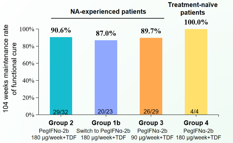2025年公布的PEG IFNα-2b 3期延长随访研究[59]纳入88例实现临床治愈的患者,显示真正临床治愈的患者继续延长随访104周的维持率约90%:在104周延长随访时,各组分别有90.6%、87.0%、89.7%和100%的患者维持临床治愈。