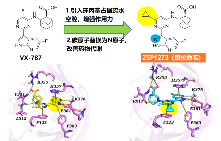 基于上述背景,在我国新型举国体制下,广州国家实验室联合广州呼吸健康研究院、广东众生睿创、广州医科大学附属第一医院等企业和医院,形成“串珠成链”的研发合力。通过计算和分子对接分析,研发团队基于VX-787结构设计合成了新分子ZSP1273(昂拉地韦),通过引入环丙基占据疏水空腔增强作用力,将碳原子替换为N原子改善药物代谢,获得具有自主知识产权的新分子。昂拉地韦作为“帽子”结构类似物与PB2亚基结合,抑制RNA聚合酶复合物的复制启动。PB2靶标具有病毒复制核心亚基、功能高度保守、宿主无同源蛋白等优点,使药物具备强效、高耐药屏障、低毒安全的潜在优势,对奥司他韦、玛巴洛沙韦耐药病毒株保持敏感。