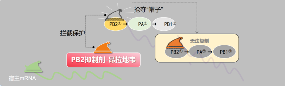 图3. 昂拉地韦为“帽子”结构的类似物与PB2亚基结合,进而抑制RNA聚合酶复合物的复制启动(引自讲者幻灯)