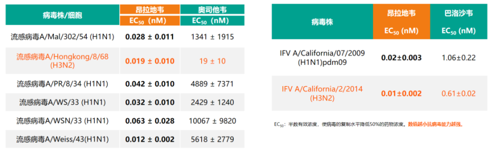 表1. 昂拉地韦对多种流感病毒株的半数有效浓度(EC50)