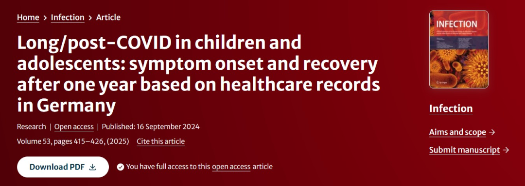 编者按:新冠疫情的阴霾虽已逐渐散去,但其对人类健康的长期影响仍在持续,长新冠(Long-COVID)便是其中最具代表性的挑战之一。长新冠是指在新冠感染后,持续超过急性期的健康问题。这些症状可能在感染后数周甚至数月内仍然存在,给人们的生活带来诸多不便。尤其在儿童和青少年群体中,长新冠的发病率、症状表现以及恢复情况一直是公众和医学界关注的焦点。最近,《感染》(Infection)杂志发表的一项研究分析了儿童和青少年在新冠感染后一年内的健康变化。