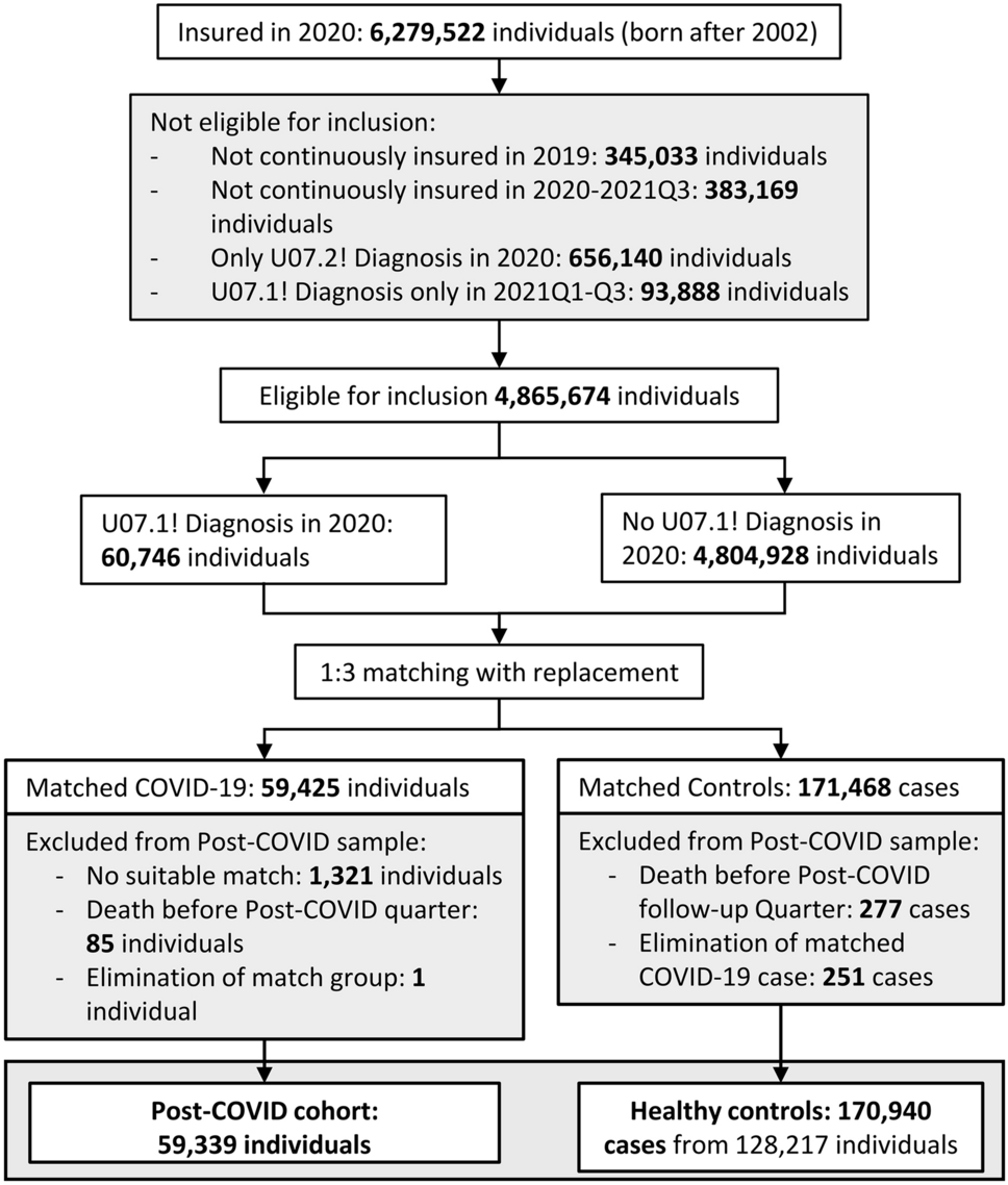 这项研究采用回顾性队列研究设计,研究纳入了2020年德国59 339名确诊新冠的儿童和青少年,以及170 940名匹配的对照组。2020年1月1日至12月31日,将通过聚合酶链式反应(PCR)确诊的SARS-CoV-2感染病例(ICD-10:U07.1!)纳入COVID-19组并进行分析,随访至2021年9月30日。从未检测出SARS-CoV-2感染阳性的儿童和青少年作为对照组。
