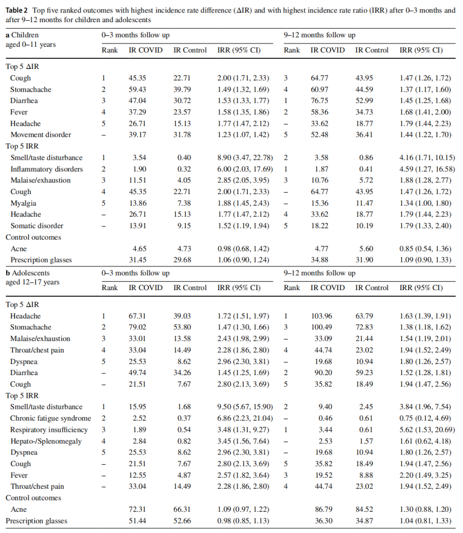 按96种不同的健康结局、13种复合诊断结局(diagnostic complexes)和3个总体健康领域,对潜在的PASC进行了分析。每个结局都与一个或多个ICD-10编码相关,有时也包括一些罕见病症(如炎症性疾病)。通过泊松回归模型计算发病率绝对差异(ΔIR)和发病率比(IRR),并根据年龄(0-11岁和12-17岁)和性别进行分层分析。