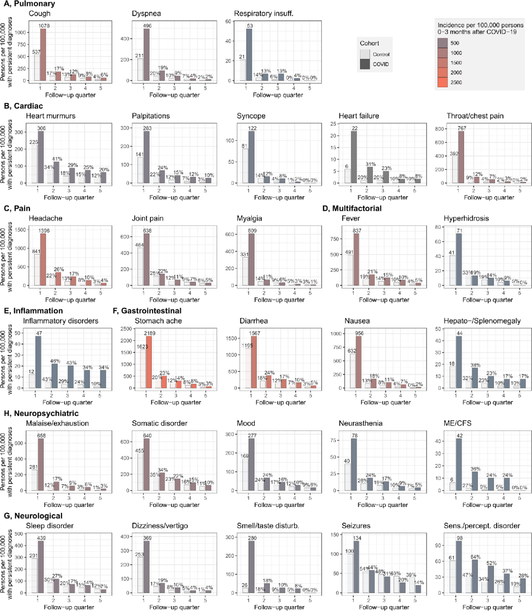 大多数症状在六个月后显著下降,随访一年后,症状持续病例比例降至10%以下。两组患者的症状持续率基本相似。在COVID-19组中,肌痛、关节痛、睡眠障碍、情绪波动和多汗症等症状恢复较快,两组患者的病例数最终趋于一致;而心脏和胃肠道症状、炎症、呼吸功能不全、疲劳(乏力/疲惫或ME/CFS)以及感觉/知觉障碍持续时间更长。