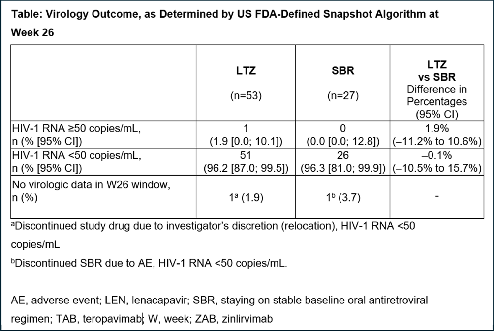 在此前开展的非比较性Ⅰb期研究(NCT04811040)中,长效HIV-1衣壳抑制剂来那帕韦(LEN)与广谱中和抗体(bNAbs)Teropavimab(TAB,GS-5423)和Zinlirvimab(ZAB,GS-2872)联合应用,在20例对这两种bNAbs高度敏感的HIV-1感染者(PWH)中,有18例在给药后6个月内维持了病毒学抑制(VS;HIV-1 RNA<50 copies/mL)。本项Ⅱ期研究(NCT05729568)旨在评估每6个月(Q6M)使用一次LEN+TAB+ZAB(LTZ)对比继续使用稳定的基线口服抗反转录病毒方案(SBR)的疗效和安全性。