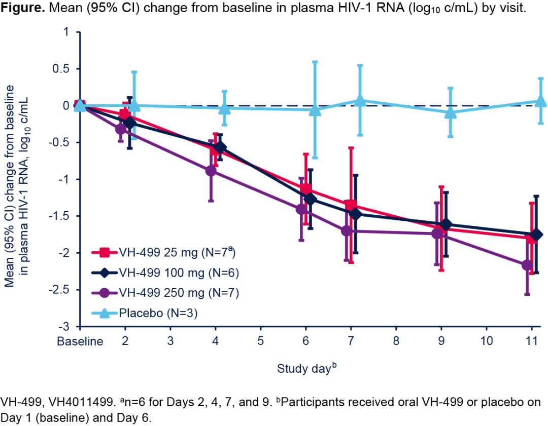 VH-499单药治疗耐受性良好,具有良好的安全性,并在PWH中显示出极强的抗病毒活性,10天内HIV-1 RNA平均最大降幅达2.2 log10 copies/mL。VH-499的暴露-反应关系已经确立。这些结果支持将VH-499作为完整长效治疗方案的一部分,用于HIV-1治疗的进一步开发。
