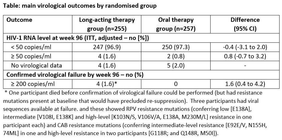主要终点为96周时病毒抑制率(病毒载量<50 copies/mL的参与者百分比,非劣效性界值为10%),次要终点包括确认的病毒学失败(CVF)及耐药性分析。