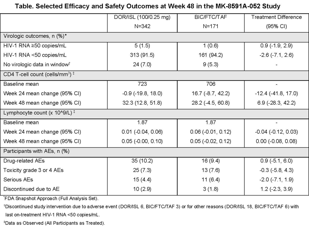 DOR/ISL(100/0.25 mg)可维持病毒抑制,且在第48周时的疗效不劣于BIC/FTC/TAF。DOR/ISL耐受性良好,安全性与BIC/FTC/TAF相似,且不会对淋巴细胞产生不良影响。