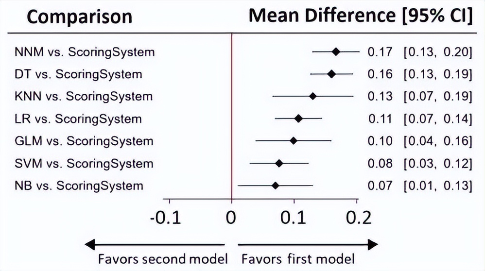 △不同ML方法与传统评分系统对比的森林图