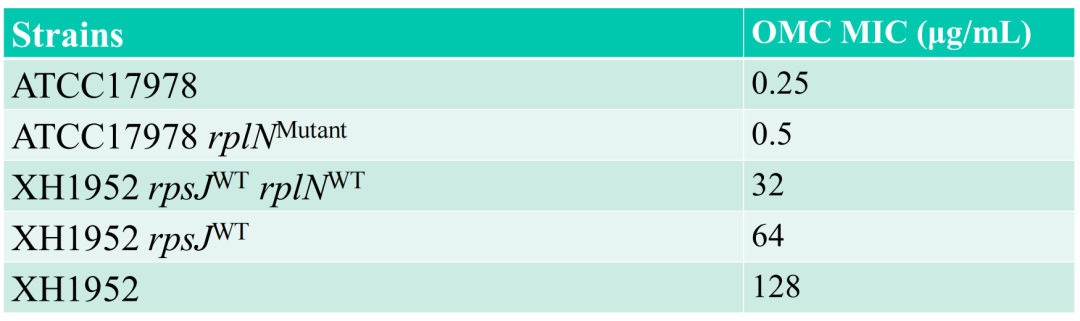 表1. 奥马环素对野生株、进化株与核糖体突变体重建株的体外活性