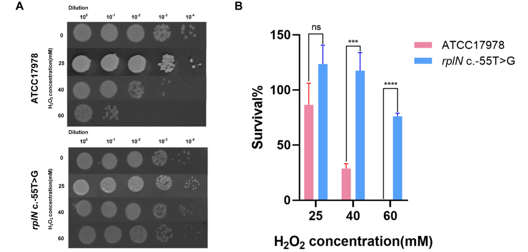 图3. 瞬时高浓度H2O2暴露后野生株和rplN基因间突变株的细菌存活率。(A)菌落总数计数结果,(B)存活率比较。