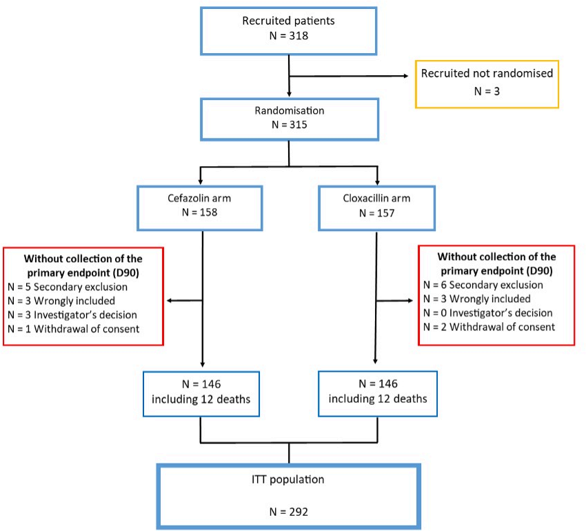 本研究为法国一项开放标签、随机对照非劣效性试验。纳入标准为无血管内装置或中枢神经系统感染的成人MSSA菌血症患者。患者按1:1随机接受氯唑西林(CLO)或头孢唑林(CFZ)治疗前7天,后续治疗由研究者决定(总疗程≥14天)。主要终点为治疗成功,定义为存活且第3天(心内膜炎为第5天)细菌学成功、无复发且第90天临床成功。非劣效性界值为12%。