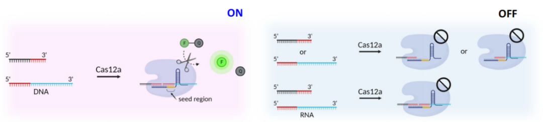(ii)II类V型CRISPR-Cas12a系统可以识别dsDNA和ssDNA,并表现出非特异性的ssDNA反式切割活性。RNA与crRNA的结合区域非常重要,ssDNA必须位于crRNA的5'端,这是一个在Cas12a蛋白的目标识别和切割中起关键作用的种子区域。当RNA位于crRNA的3'端并由位于crRNA5'端的DNA激活时,Cas12a可以直接识别RNA靶标,从而实现RNA的直接检测
