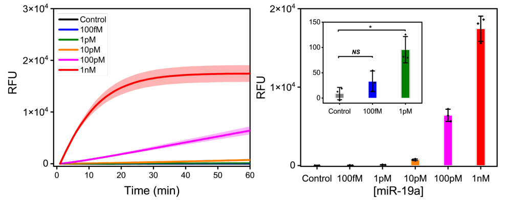 图4. 靶基因miR-19a在100 fM~1 nM范围内的实时荧光信号