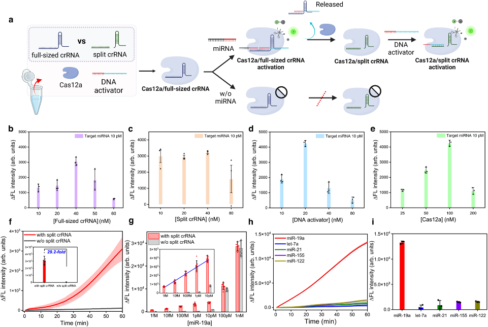 (i)研究者利用竞争性crRNA的特定非对称反式切割行为,开发了一种信号放大方法,只需添加分裂crRNA及目标ssDNA即可提高CRISPR的灵敏度,这是首次报道利用具有不同CRISPR反应活性的竞争性crRNA实现信号放大的方法。
