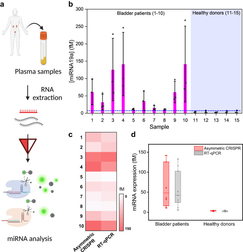 miRNA与多种癌症的发展和进展有关。通过检测体液(如血液、尿液或唾液)中miRNA表达水平的变化,miRNA液体活检可以提供关于疾病的重要诊断和预后信息,并且比组织活检更方便且对患者更友好。研究表明miR-19a在膀胱癌患者中过表达,促进了膀胱癌的生长和转移。研究者使用非对称CRISPR检测分析了膀胱癌患者血浆样本中miR-19a的表达水平,结果证实,与健康者样本相比,膀胱癌患者样本中miR-19a的总体表达水平更高。同时与RT-qPCR的平行对比结果显示,这种检测方法与RT-qPCR的结果显示出极好的相关性。这些临床测试结果表明,非对称CRISPR方法能够简单、快速且无扩增地检测临床样本中的miRNA,并具有高灵敏度,为其临床应用提供了实证支持。