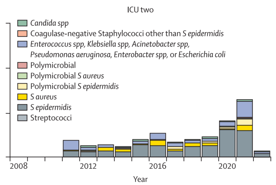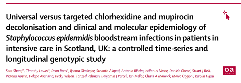 [1]Sharaf, Sara et al.Universal versus targeted chlorhexidine and mupirocin decolonisation and clinical and molecular epidemiology of Staphylococcus epidermidis bloodstream infections in patients in intensive care in Scotland, UK: a controlled time-series and longitudinal genotypic study.The Lancet Microbe, Volume 0, Issue 0, 101118