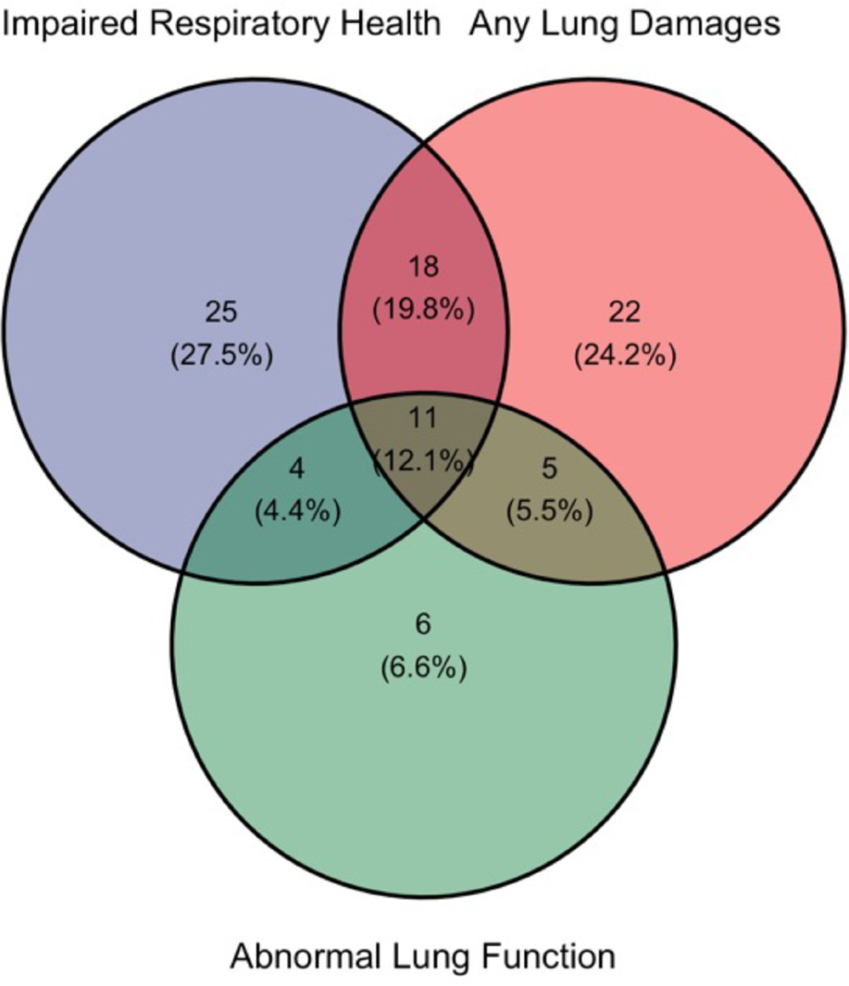 呼吸健康受损:SGRQ-C任一维度评分异常;