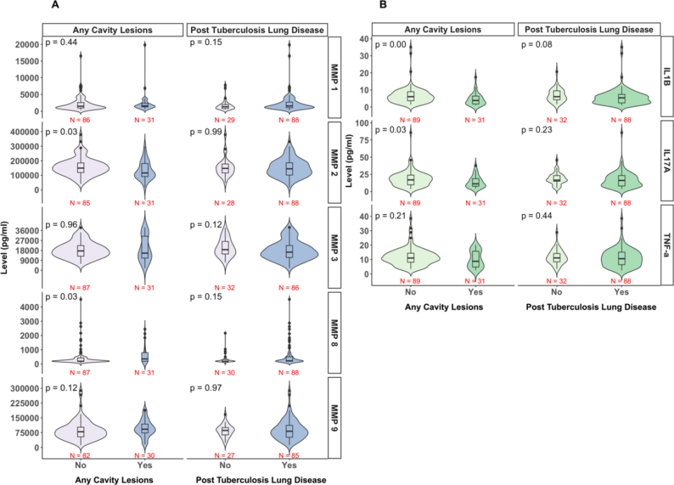空洞性病变与非空洞性病变患者对比:至少一个空洞性病变的患者中,IL-1β(3.8 vs. 6.1 pg/mL,P≤0.01)和IL-17A(11.2 vs. 16.9 pg/mL,P=0.03)的中位值显著低于无空洞患者(图3B)。