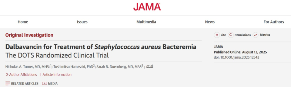 Turner NA, Hamasaki T, Doernberg SB, et al. Dalbavancin for Treatment of Staphylococcus aureus Bacteremia: The DOTS Randomized Clinical Trial. JAMA. Published online August 13, 2025. doi:10.1001/jama.2025.12543