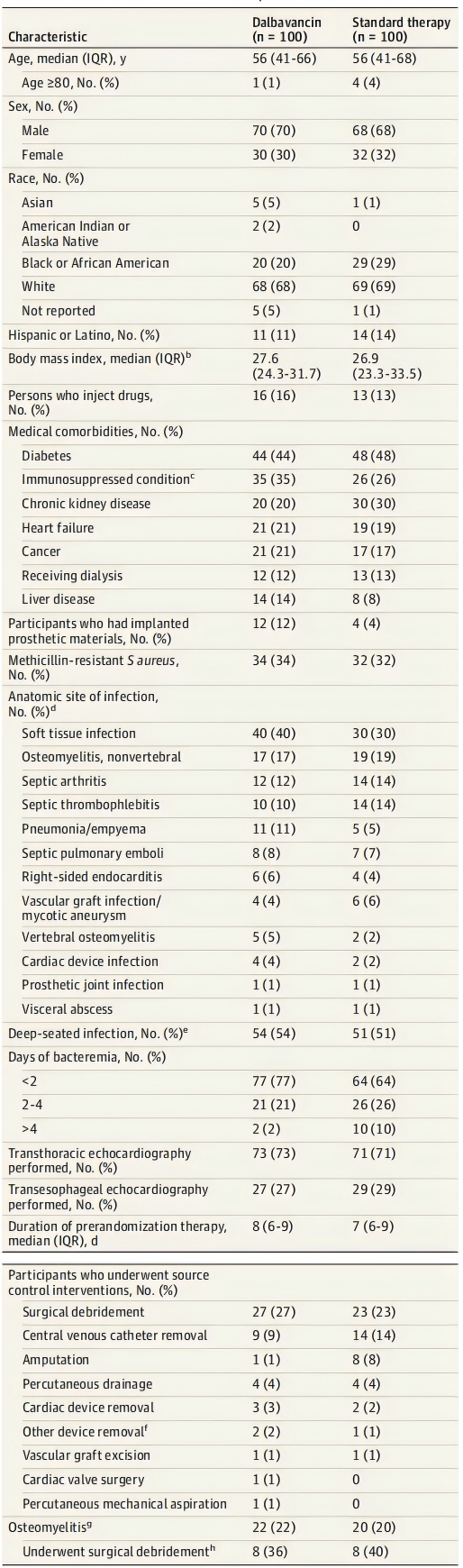 200例患者平均年龄56岁,31%为女性,基线合并症(糖尿病、免疫功能不全、慢性肾病等)和感染部位分布(软组织感染、骨髓炎、脓毒性关节炎等)在两组间无显著差异。菌株敏感性方面,67%为MSSA,33%为MRSA。