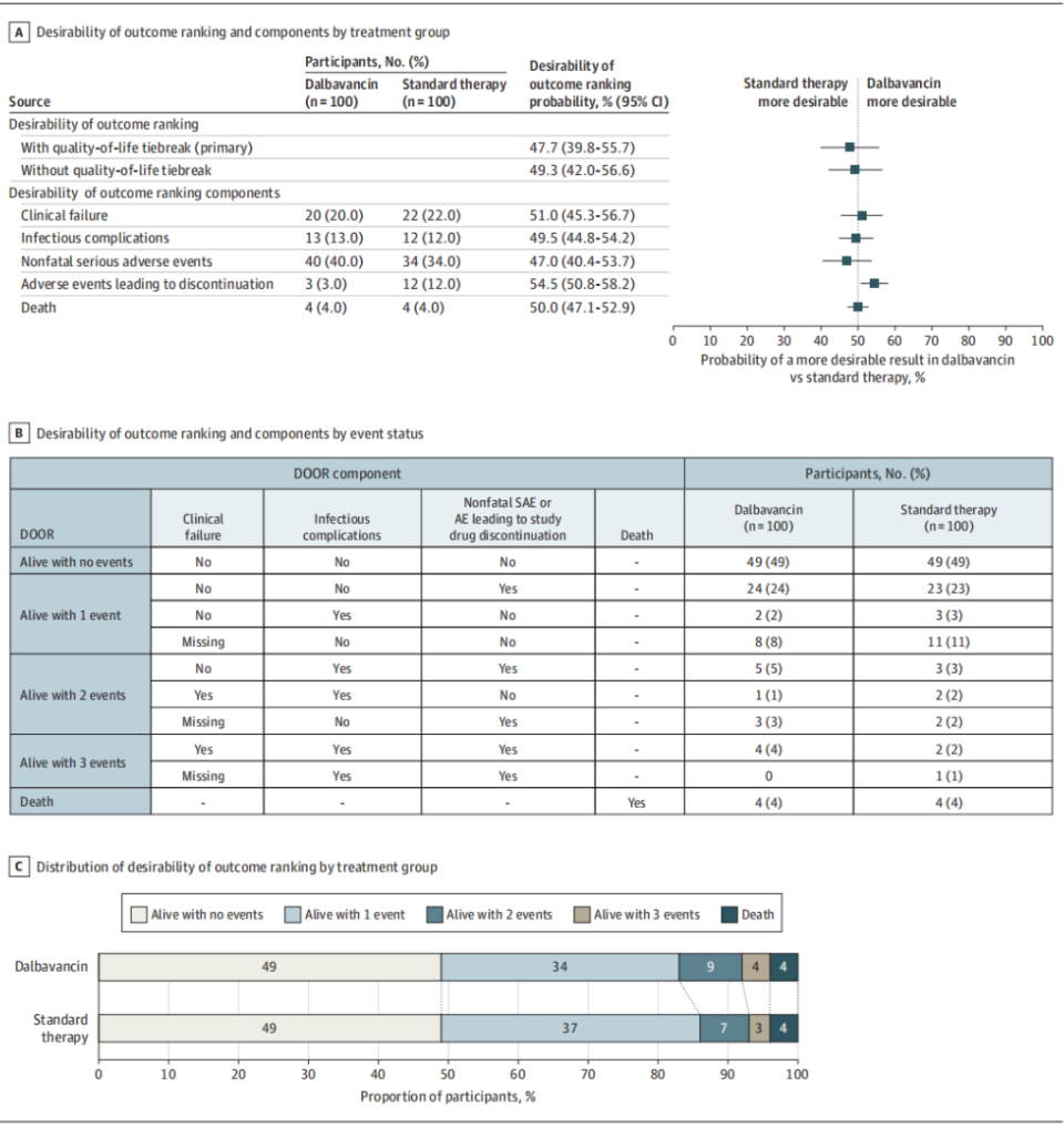 主要结局:随机化后70天的结局排名的可取性(DOOR),由4名设盲的感染病专家评估,综合5个维度的指标(临床成功、感染并发症、安全性并发症、死亡率、健康相关生活质量),评分越高代表结局越优,优效性判定标准为达巴万星组DOOR评分更优的概率95%CI>50%。