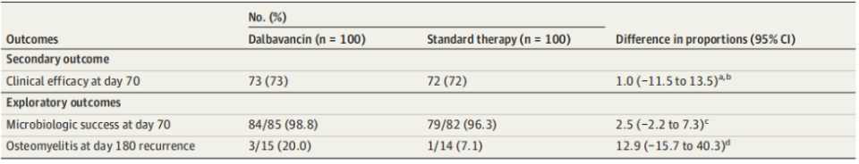 探索性结局:微生物学成功(随机化后血液或其他无菌部位无基线菌株生长)、骨髓炎患者180天复发率。