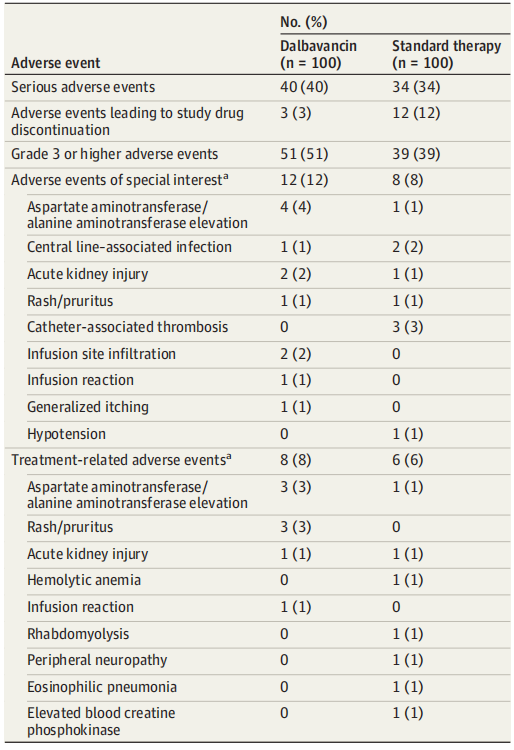 安全性方面,达巴万星组和标准治疗组严重不良事件发生率相近(40% vs. 34%),治疗相关不良事件均少见(8% vs. 6%),主要包括转氨酶升高、皮疹、急性肾损伤等。