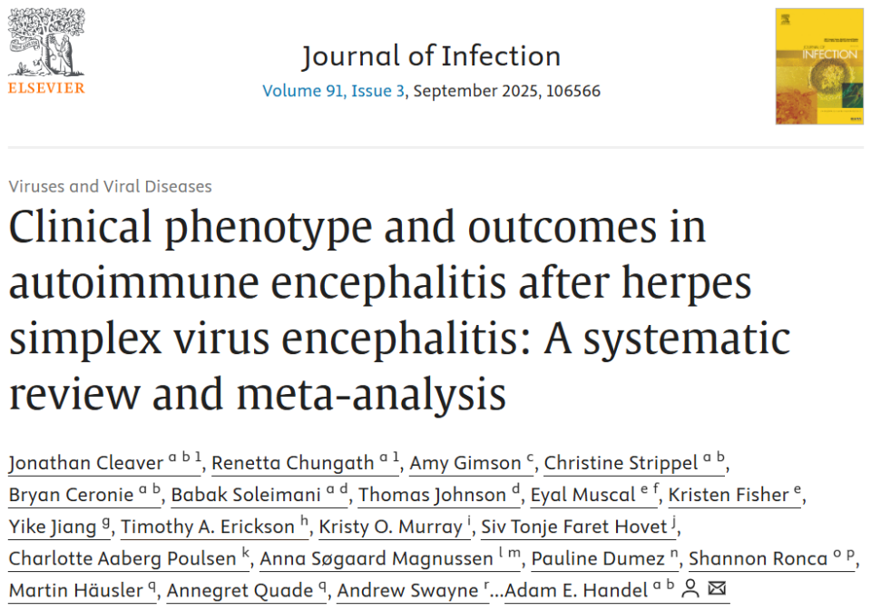 参考文献:Cleaver J, Chungath R, Gimson A, et al. Clinical phenotype and outcomes in autoimmune encephalitis after herpes simplex virus encephalitis: A systematic review and meta-analysis. J Infect. Published online August 6, 2025. doi:10.1016/j.jinf.2025.106566