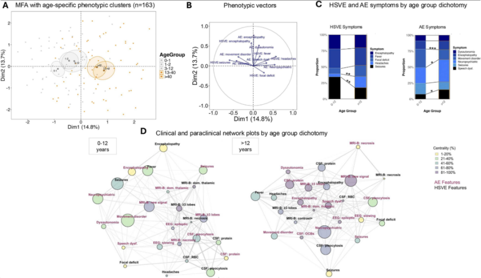研究者系统检索了2007年至2024年Embase、Medline、PubMed和Web of Science数据库中符合共识诊断标准的确诊HSVE后并发AE的病例。提取患者人口统计学特征、临床表型、治疗方案及预后数据,采用降维分析、网络分析和多变量逻辑回归分析,探索年龄特异性和诊断特异性模式及预后预测因素。