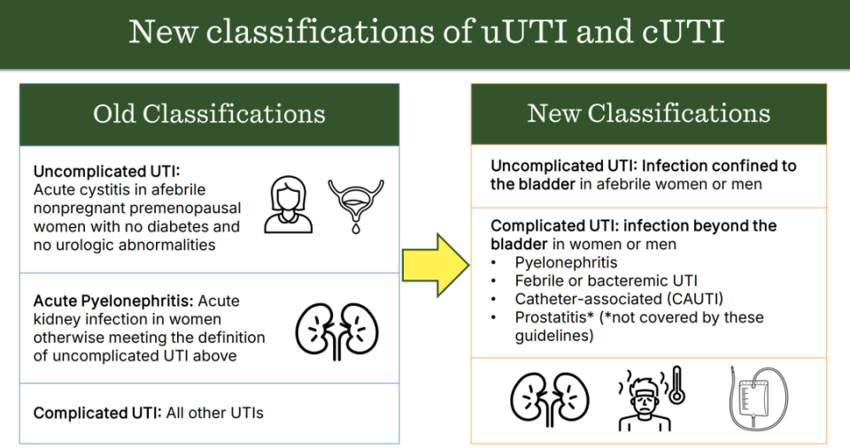 新版指南对UTI分类的重点在于判断感染范围:若仅局限于膀胱,则定义为uUTI;若出现全身性疾病体征(如发热或菌血症)以及导尿管相关感染、肾盂肾炎的临床体征,均提示感染已超出膀胱范围,则定义为cUTI。