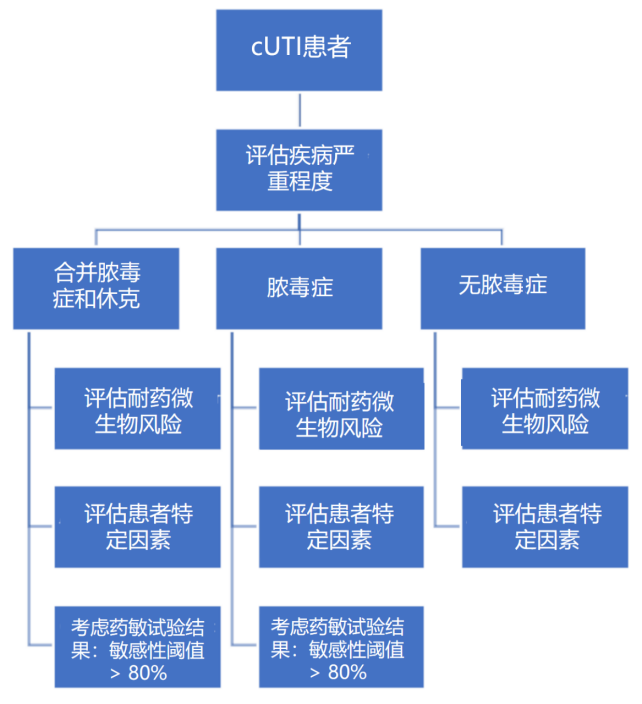 鉴于不同医院及不同患者间的耐药情况存在极大差异,专家组认为并不存在一种适用于所有cUTI患者经验性治疗的最佳药物。因此,新版指南并未推荐某个特定药物作为cUTI经验性治疗的首选药物,而是提出了一个“四步流程”用以对患者进行个体化决策。