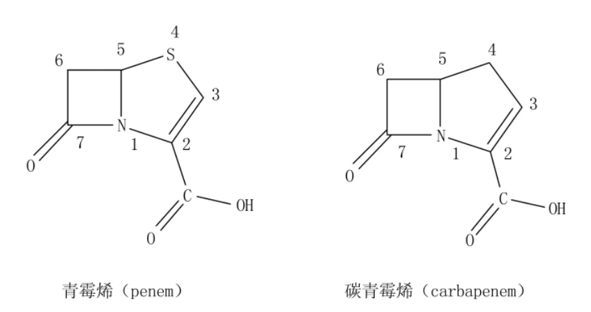 图1. 青霉烯(左)和碳青霉烯类(右)药物的母核结构