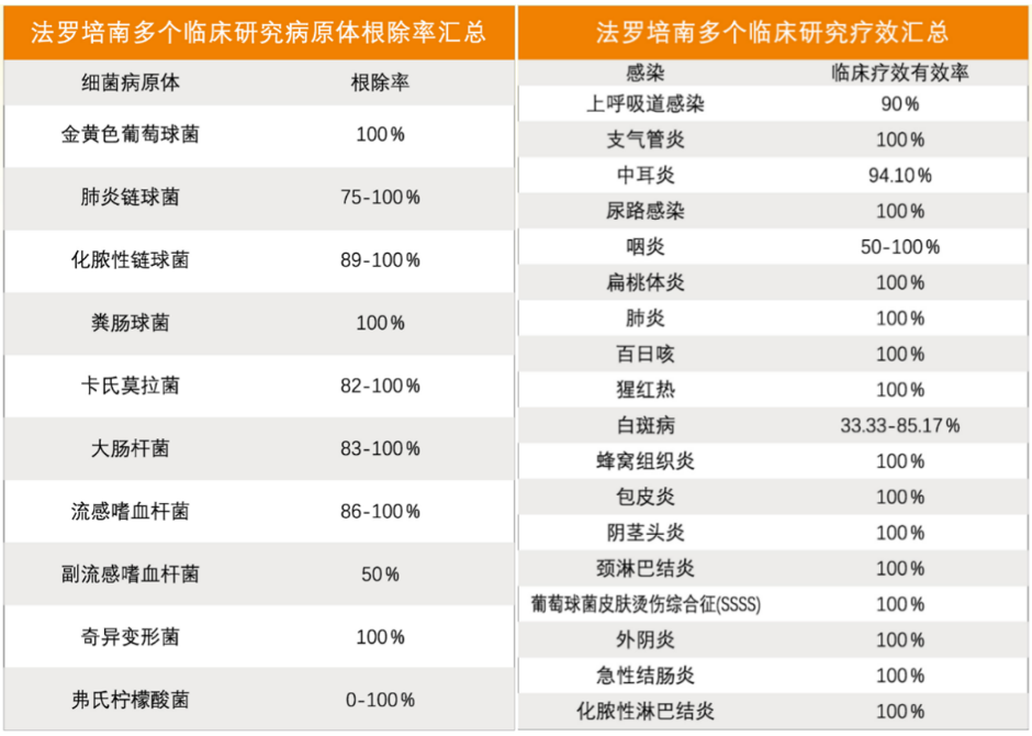 临床研究数据显示,法罗培南对金黄色葡萄球菌、粪肠球菌、奇异变形菌等多种临床常见病原体的根除率达到100%;在治疗尿路感染、肺炎、支气管炎、猩红热、百日咳等细菌感染时,其临床有效率同样达到100%[10]。