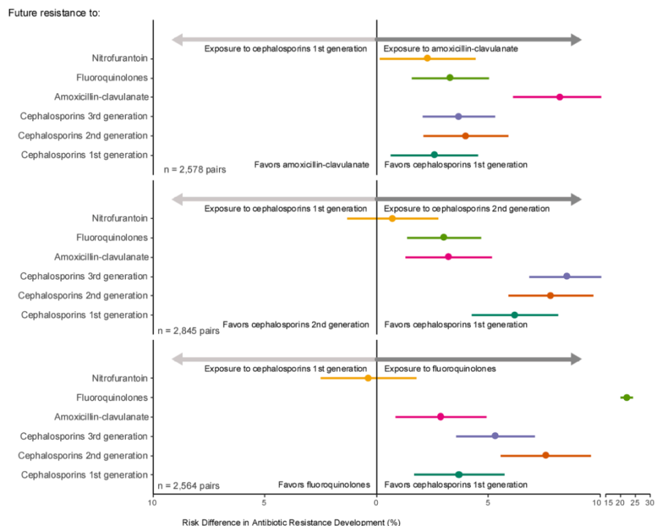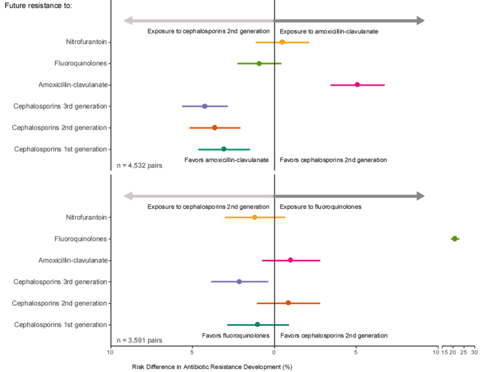 暴露于阿莫西林-克拉维酸或氟喹诺酮类后,相较于第二代头孢菌素,未来发生抗生素耐药的风险差值