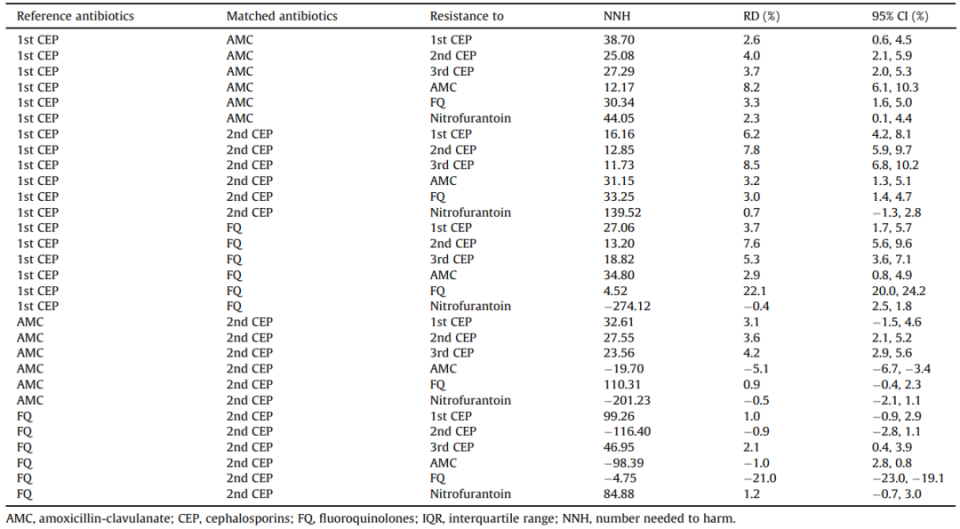 不同抗生素的风险差异和需伤害人数:阿莫西林-克拉维酸、头孢菌素和氟喹诺酮类药物
